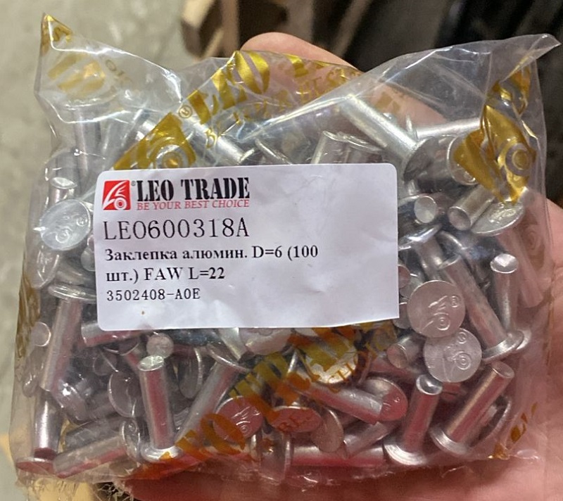 Главная - Каталог запчастей - FAW - Заклёпка колодки тормозной 6*22 (алюминиевая; 100 шт.) (3310,3250) -J6 FAW / CAMC LEO